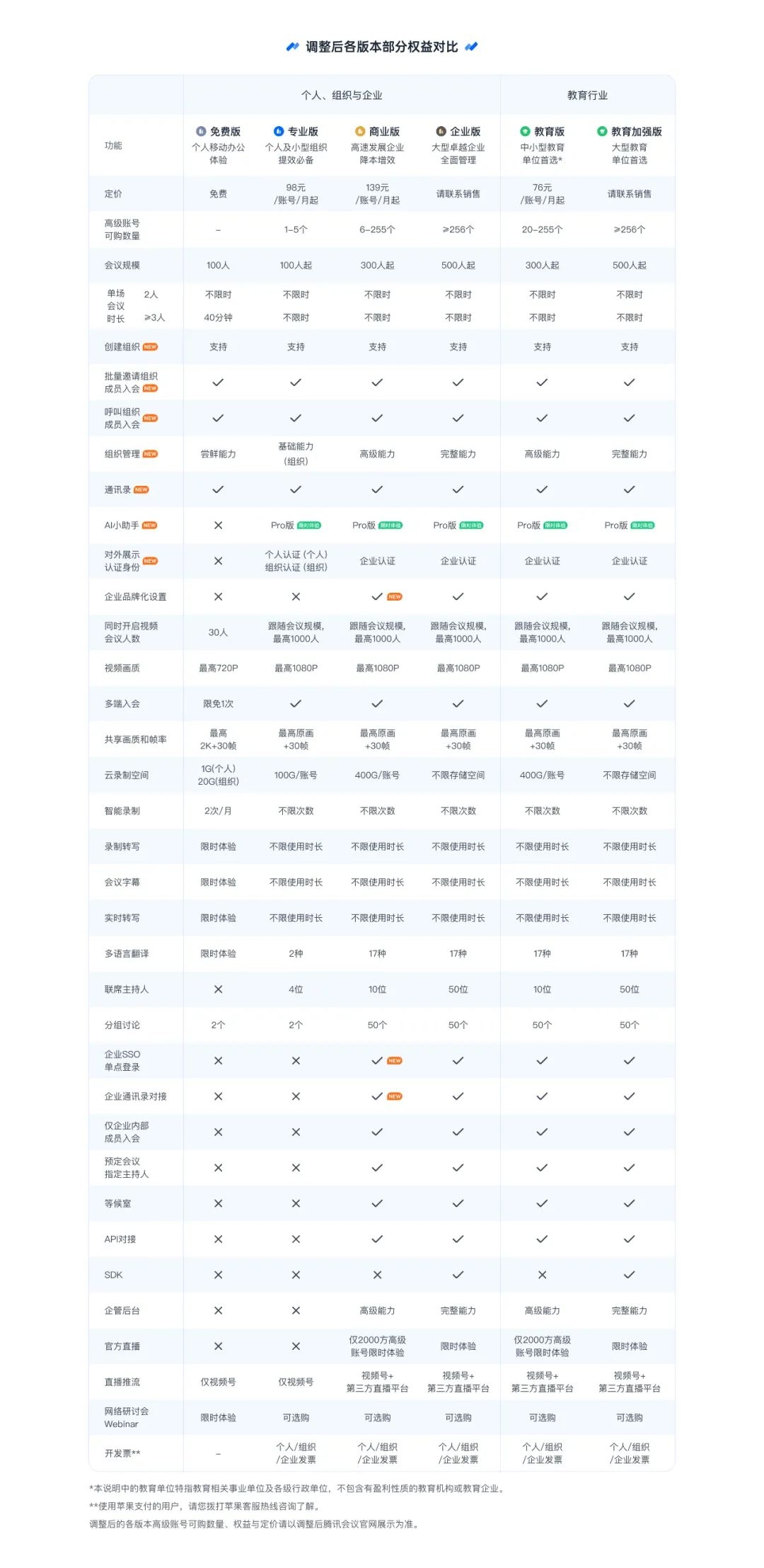 为了满足不同用户群体的多样化需求,自2025年1月起,腾讯会议的服务模式将逐步升级为免费版、专业版、商业版与企业版。